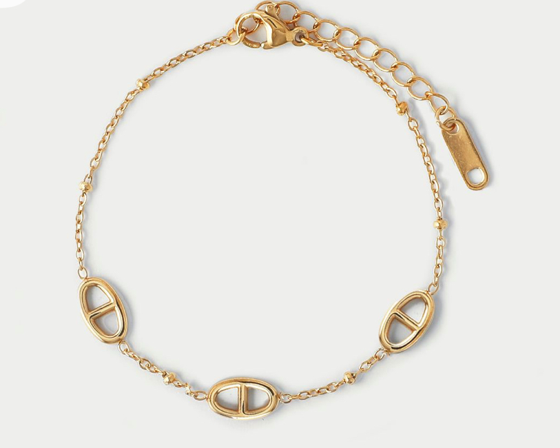 Bracelet fin et élégant en acier inoxydable doré, orné de motifs ovales modernes. Léger et intemporel, il se porte facilement au quotidien ou en accumulation.